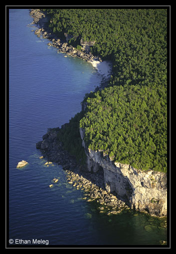 The Bruce Peninsula is particularly impressive from the air. Home to the largest remaining chunk of natural habitat in southern Ontario, the Bruce is blanketed with a mosaic of forests, wetlands, lakes and rugged shorelines - all interwoven. The cliffs of the Niagara Escarpment, which plunge into the azure waters of Georgian Bay on the east shore of the peninsula, are simply awesome. Although a sizeable portion of the Bruce Peninsula is protected, cottage development is an imminent threat to all unprotected shorelines. The undeveloped tracks are critically valuable.
